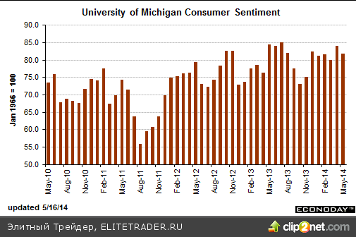 В то же время данные Университета Мичигана по потребительскому доверию за май указали на снижение индекса с 84,1 до 81,8, тогда как аналитики ожидали роста до 84,5 пункта. Однако глядя на его динамику, можно сказать, что уровни выше 80 видятся вполне комфортными.
