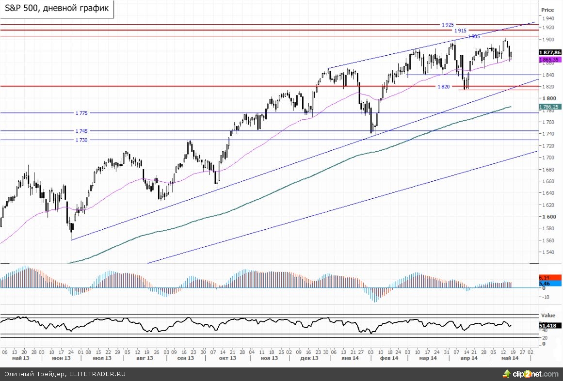 Отскочили в пятницу американские индексы после предыдущих двух дней снижения. Индекс SnP500 прибавил 0,37%. Напомним, что на прошлой неделе индекс вновь обновил исторический максимум, и хотя сейчас он находится в середине «восходящего клина», формирующегося в 2014 году, в котором еще есть пространство для маневра у быков, сама фигура является медвежьей, а недельная свеча выглядит не самым оптимистичным образом.