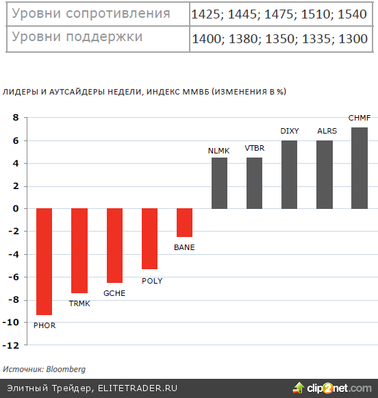 Индекс ММВБ в течение недели поступательно рос и в четверг приближался к психологически значимой отметке 1400 пунктов. Сразу протестировать ее не удалось, но и начавшаяся оттуда локальная коррекция оказалась недолгой, и в пятницу индекс снова рос, на закрытие составив 1392,30 пунктов (+1,52%)