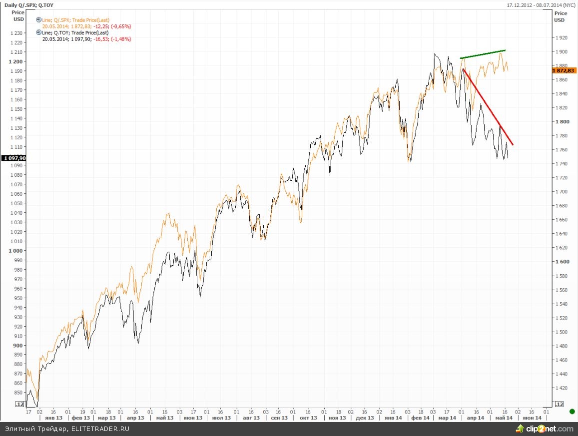 В пологом восходящем канале, если не сказать в боковике двигается на протяжении последнего месяца индекс SnP500, находясь в районе исторических максимумов. В более широком горизонте этот боковик формируется в рамках фигуры «восходящий клин», являющейся медвежьей, что вызывает определенное беспокойство в особенности на фоне предыдущего внушительного роста индекса на протяжении пяти кварталов.