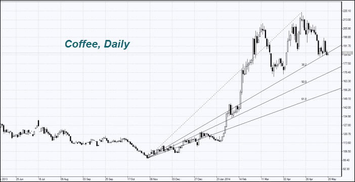 Кофе (Coffee) торгуется с повышенной волатильностью. Мы не исключаем, что на котировки воздействует активное заключение контрактов в Бразилии. По данным компании Safras e Mercado, бразильские фермеры уже продали 90% старого урожая кофе и порядка 18% нового урожая. Напомним, что в Бразилии наблюдается самая сильная засуха за последние 50 лет, что вызвало снижение прогнозов урожая кофе до 47-48 млн. мешков 60 кг.