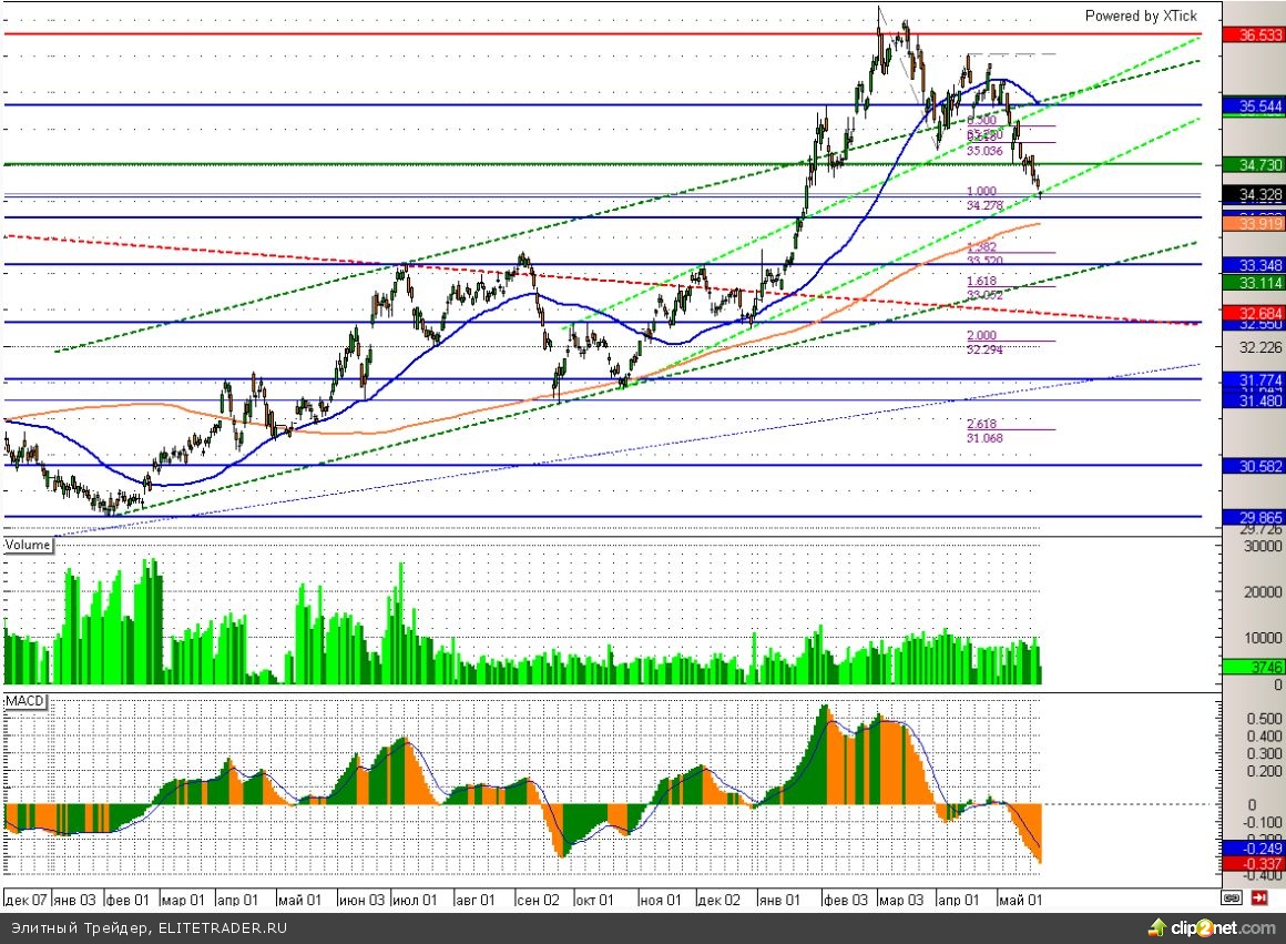 Теперь пара доллар/рубль уже вплотную подобралась к отметке 34,3, где у нее располагается ключевая поддержка в виде нижней границы восходящего канала. Пробить данную отметку без дополнительных драйверов будет крайне не просто и, вероятно, в ближайшем будущем мы все-таки дождемся некоторого отскока доллара вверх. Первой целью в этом случае может стать отметка 34,7.