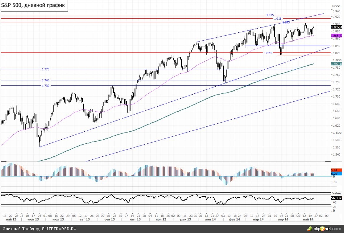 В данный момент фьючерсный контракт на SnP 500 торгуется с повышением на 0,05% около отметки 1891.