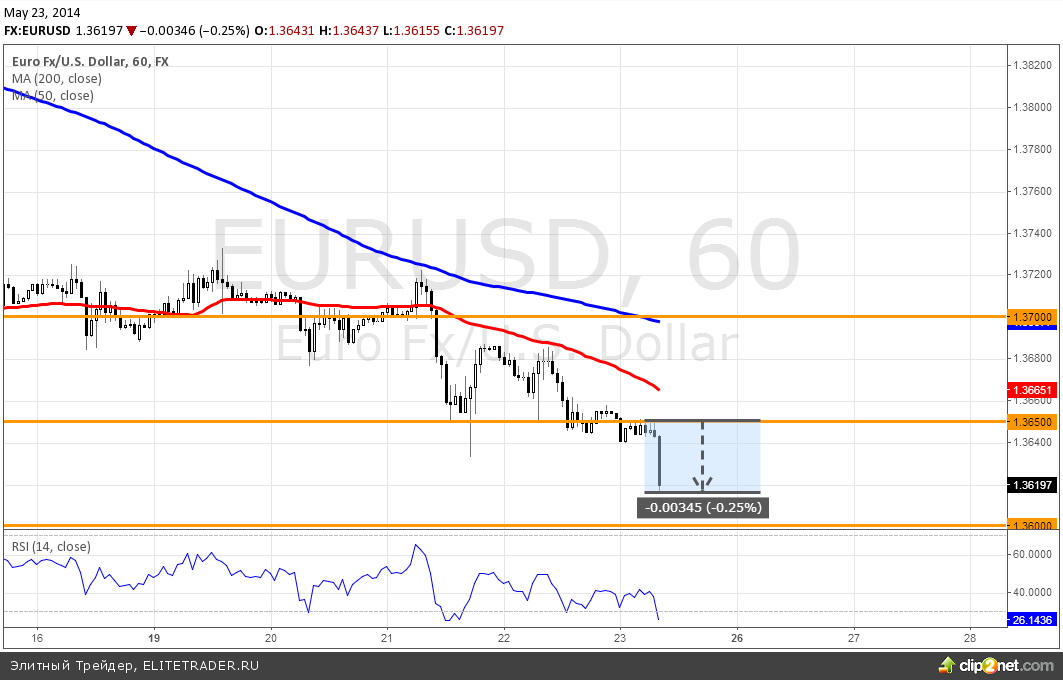 На негативном новостном фоне евро продолжает развивать тренд на снижение. Валютная пара EUR/USD снижается почти на 35 пунктов и целью для снижения выступает область $1.3600 - $1.3607. Сейчас за один евро на валютном рынке FOREX готовы отдать $1.3619 по текущему курсу.