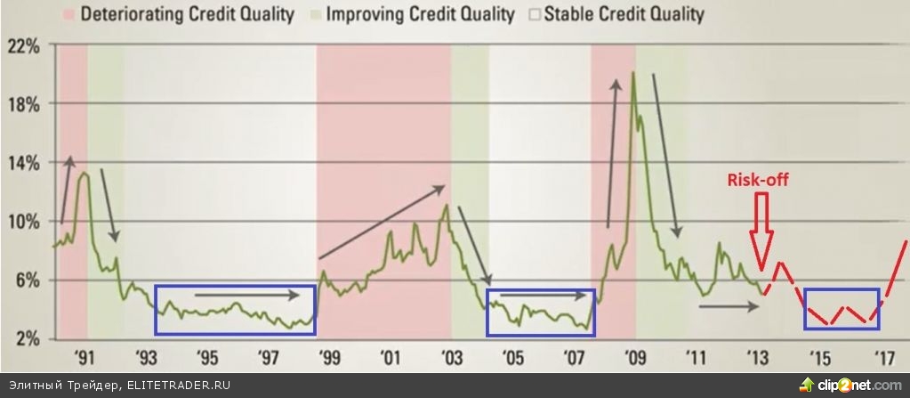 Нужно немного порассуждать и проверить цифры, что несложно сделать. Если предположить, что цены высокодоходных облигаций (HYB) находятся в перекупленном состоянии, то как правило, нужно сравнивать HYB доходности с трижерис. Ниже представлен график BofA Merrill Lynch US High Yield Master II OAS (Option-Adjusted Spread) с разметкой по период, когда и как вел себя спрэд во времени. На данном этапе спрэд составляет 435 б.п., что на 170 б.п. выше минимумов предыдущих периодов перекупленности.
