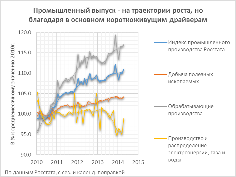 При ближайшем рассмотрении видно, что рост ускорился по причинам, которые вряд ли сохранят свое действие в сколько-нибудь долгосрочной перспективе, измеряемой хотя бы несколькими месяцами. Ускорение связано с бурно растущей нефтепереработкой (прирост за год 5.9% по объему нефти, поступившей в переработку), всплеском выпуска минеральных удобрений (12.8%), ограничениями в торговле с Украиной, сопровождавшимися определённым импортозамещением в производстве еды и алкоголя на фоне быстрого роста цен на продовольствие (производство мяса и субпродуктов выросло на 12.5%, колбас – на 7.7% в годовом сопоставлении), а также пониженной базой первых месяцев 2013 года, когда, как теперь уточнил Росстат, происходил довольно крутой спад выпуска обработанной промышленной продукции.