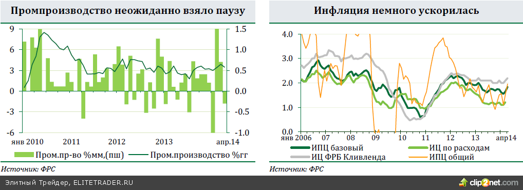 Поток из хороших новостей экономики США разбавился несколькими неприятными сюрпризами. После новостей позапрошлой недели о неожиданно низком росте ВВП в 1 квартале на прошлой неделе притормозили апрельские показатели по промышленному производству и розничным продажам. По данным одного месяца трудно судить о смене тренда, и перспективы роста экономики США по-прежнему видятся нам в положительном свете. Но эти новости должны несколько охладить горячие головы, требующие от ФРС скорейшего повышения ставок.