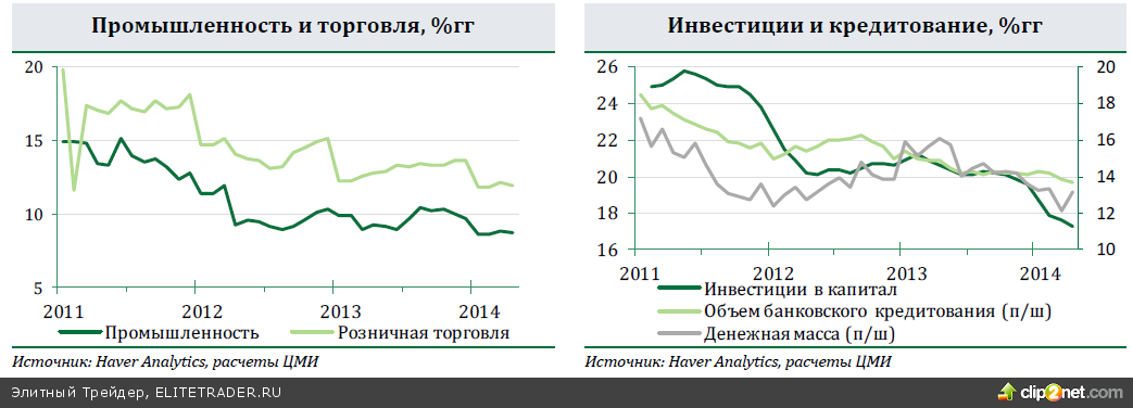 В апреле макропоказатели оказались ниже прогнозных значений и вновь подтвердили общее замедление китайской экономики. Темпы роста промышленного производства замедлились с 8,8%гг в марте до 8,7%гг в апреле, розничная торговля замедлилась с 12,2%гг до 11,9%. В начале 2014 года эти сектора демонстрируют самые низкие темпы роста с 2008-09 годов. Рекордное замедление также отмечается в объемах инвестиций в капитал и в объемах банковского кредитования. В апреле инвестиции увеличились на 17,3%гг, а кредитование - на 13,7%гг. Однако рост денежной массы ускорился с 12,1% до 13,2%гг, вновь вернувшись к целевому уровню, установленному Народным банком Китая.