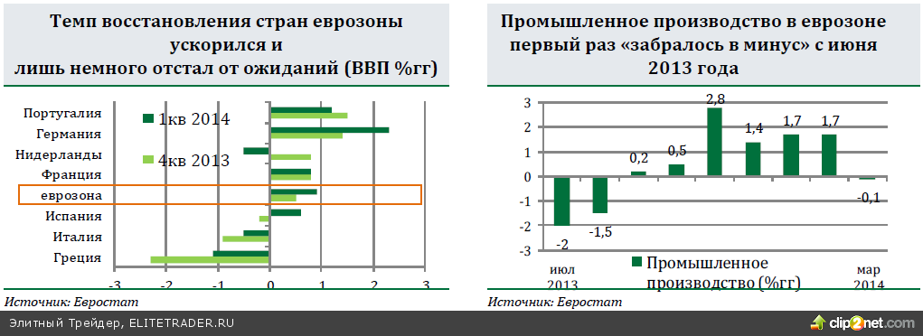Рост ВВП еврозоны в 1 кв. 2014 года (0,9%гг) оказался выше в 4кв 2013 года (0,5%гг), но всё равно не оправдал ожиданий. Французский ВВП «встал» на отметке 0,8%гг, германский - ожидаемо ускорился: с 1,4%гг до 2,3%гг. В Италии падение замедлилось до -0,5%гг (с -0,9%гг), а в Греции до -1,1%гг (с - 2,3%гг). Динамика ВВП и промышленного производства указывают на продолжение восстановления в еврозоне. Однако темп восстановления во 2- м квартале, на наш взгляд, будет ниже.