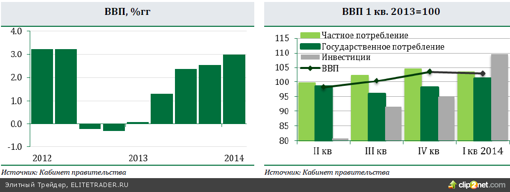 Рост ВВП в 1 кв. 2014 г. составил -0,5%кк, 0,9%гг. По итогам года мы ждем замедления роста до нуля.