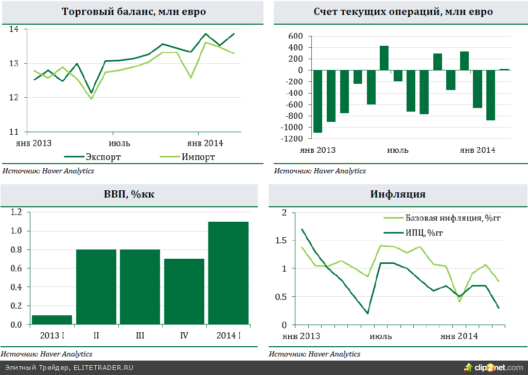В марте счет текущих операций оказался положительным впервые за три месяца, однако, причиной этому послужило снижение импорта (-1,3%мм). Экспорт вырос 2,5%мм, отыграв падение в предыдущем месяце. Торговый профицит вырос с €48 млн до €572 млн. Падение импорта, продолжающееся второй месяц подряд, является следствием слабого роста внутреннего спроса. Это подтверждает и сокращение розничных продаж в марте, и замедление инфляции: рост индекса потребительских цен в апреле сократился с 0,6%гг до 0,3%гг (+0,0%мм). Базовая инфляция составила +0,8%гг (-0,4%мм).