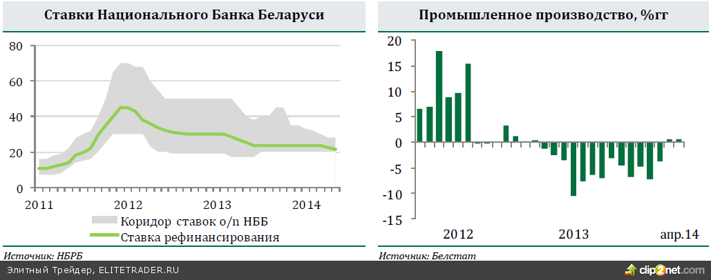 Несмотря на резкое ускорение инфляции в апреле до 17,2%гг, Национальный Банк понизил ставку рефинансирования на 1пп до уровня 21,5%. Политика регулятора направленна на повышение доступности кредитных ресурсов в экономике. Подобная политика в прошлом имела неприятные последствия и привела к экономической разбалансировке и девальвации белорусского рубля. Вот и сейчас мы ожидаем дальнейшего ускорения инфляции и нового витка девальвационных ожиданий.