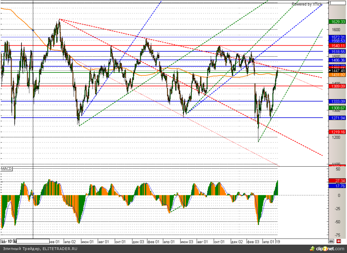 Российский рынок закончил торговый день на положительной территории. ММВБ по итогам дня прибавил более 0,5%, но что еще утром данный рост составлял более 1%, данное окончание торговой сессии можно считать победой «медведей». В итоге закрытие прошло ниже 1450, и теперь наиболее вероятны коррекция или консолидация возле текущих уровней.