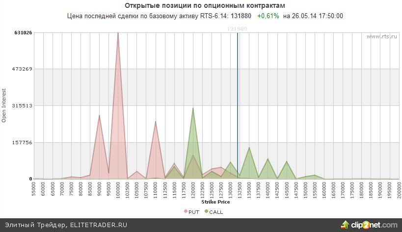 Между тем открытые опционные позиции по RIM4 со сроком исполнения 16.06.14 сейчас смотрят вниз. Большое количество открытых опционов колл расположилось на уровне 135000, а эквивалентное количество опционов пут находится лишь в районе 120000.