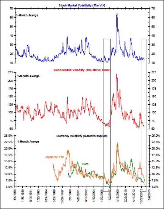 "Доминирующей темой на всех рынках в настоящее время является падение волатильности. На этой неделе, например, Джим Бьянко заметил, что волатильность облигаций, валют и акций находится на минимумах, которые мы видели один раз за последние 25 лет — в 2007 году.