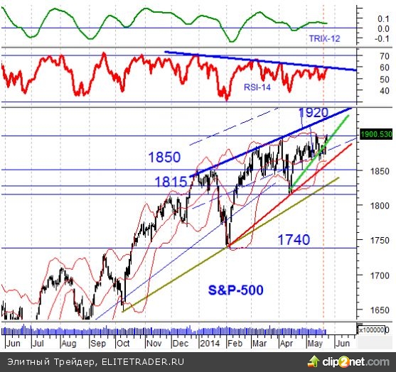 На графиках мировых индексов мы видим противоречивую картину. На американских индексах есть сигналы к продолжению роста – в четверг индекс Nasdaq Composite впервые с 4 апреля поднялся выше 50-дневной SMA, индекс SnP-500 закрылся в пятницу выше уровня 1900. На графиках некоторых развивающихся стран (Индия, Китай) есть технические сигналы в пользу снижения. Эта противоречивая картина, а так же неспособность нефтяных цен (Brent) закрепиться выше отметки 111 приведут сегодня к торможению фондового рынка. С трудом просматривается портрет инвестора, который будет покупать акции, не дождавшись итогов сегодняшнего внеочередного саммита ЕС. На саммите будет обсуждаться третий этап санкций против России. С прицелом же до конца года я настроен оптимистично и по-прежнему жду индекс ММВБ на отметке 1520 пунктов.