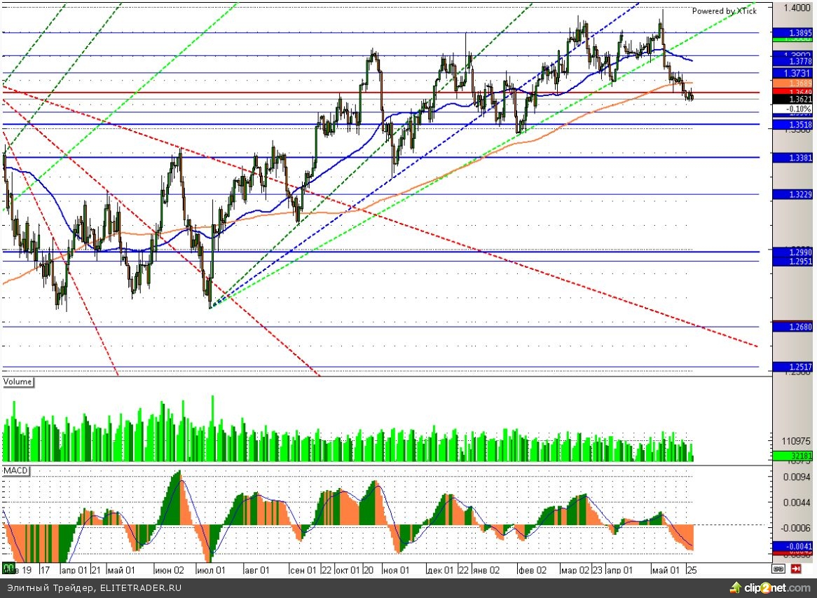 В свою очередь евро продолжает консолидироваться вблизи ключевой поддержки 1,36. Закрепление ниже данного уровня может придать ускорение снижению, что имеет достаточно неплохую вероятность. Кроме возможного дополнительного стимулирования экономики еврозоны на данную валютную пару негативное давление оказывает также макроэкономическая статистика. В частности потребительские расходы во Франции неожиданно упали в апреле на 0,3%, а число безработных в Германии увеличилось в мае на 24 тыс.
