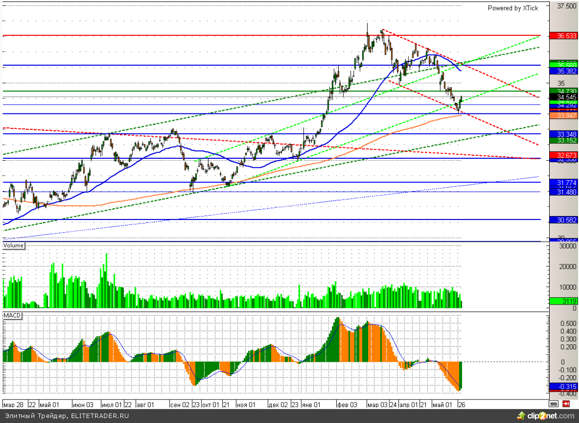 Пара доллар/рубль уже вернулась внутрь восходящего канала и, похоже, останавливаться на этом пока не планирует. Ближайшим сопротивлением сейчас является уровень 34,6 и если в ближайшем будущем участники смогут его преодолеть, то подъем может ускориться. Основным драйвером ослабления российской валюты остается ситуация на Украине. В данный момент остро стоит вопрос: станет ли Украина отдавать долги за российский газ, а также как долго и во что перерастут боевые действия на юго-востоке страны. Если напряженность продолжит расти, то могут последовать дополнительные санкции для России, что крайне негативно для национальной валюты. Между тем дополнительную поддержку доллару продолжают оказывать покупки иностранной валюты Банком России для Минфина. Единственное, что сдерживает падение российской валюты – это высокие цены на нефть, которые по сорту Brent уверенно закрепились выше 110 долларов за баррель.