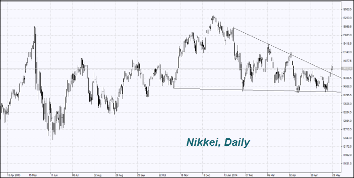 Японский фондовый индекс Nikkei во вторник вырос в четвертый раз подряд на фоне позитивной динамики остальных фондовых рынков. Сегодня он консолидируется из-за падения акций крупной девелоперской компании Mitsui Fudosan на 4,7%. Она объявила о дополнительной эмиссии и увеличении уставного капитала на 11%. Отметим, что сегодня ночью в 23-50 СЕТ выйдут показатели розничной торговли Японии за апрель и еженедельные данные по покупке-продажи активов от японского Минфина. Основным событием, которое ожидают инвесторы, может стать выступление премьер-министра Синдзо Абе по поводу его экономической стратегии, называемой «Абеномикой». Оно может состояться в начале июня.