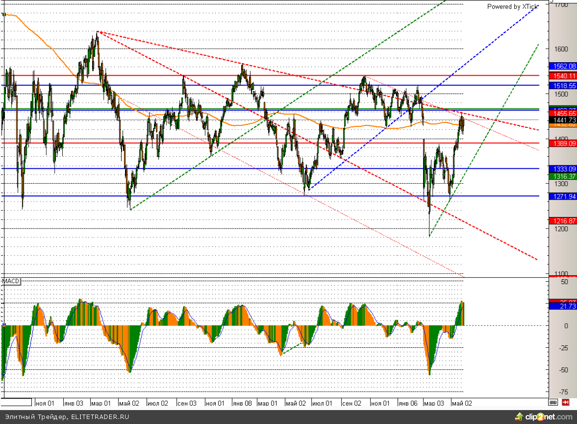 Российский рынок сегодня растет и даже успел попытаться преодолеть 1450 по ММВБ, где проходит нисходящая трендовая линия. Впрочем, данная попытка пока не удалась, и участники снова начали фиксировать прибыль. Для преодоления столь значимого сопротивления потребуются сильные драйверы, которых на данный момент, к сожалению нет.