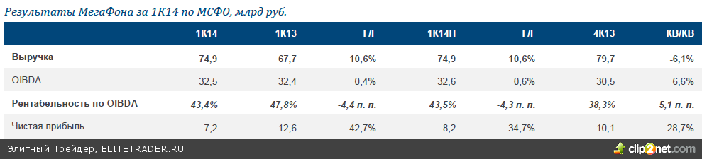 МегаФон представил свои финансовые результаты по МСФО за 1К14, которые в точности совпали с нашими ожиданиями и были близки к консенсус-прогнозу. Важно отметить, что компания подтвердила прогноз по росту выручки за весь 2014 год на уровне 6–8% г/г. МегаФон также сохранил прогноз рентабельности по OIBDA на 2014 год на уровне «не менее» 44%, и это несмотря на негативный эффект от недавно приобретенного Скартел/Yota.