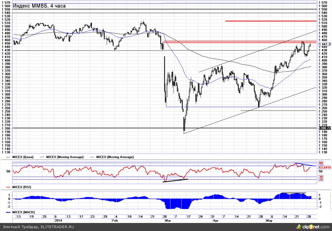 Российский рынок завершил торговую сессию четверга ростом на 1,5% по ММВБ. При этом индекс снова вплотную приблизился к отметке 1450, где проходит нисходящая трендовая линия. Закрепление выше данной отметки может ускорить растущую динамику, но вот драйверов для этого пока слишком мало.