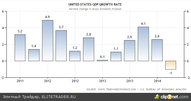 Таким образом, экономика США падает впервые с 2011 года. Столь резкое снижение всеми экспертами объясняется холодной погодой в январе-марте, поэтому во втором квартале аналитики в среднем рассчитывают на рост в 3,5% (кв/кв). Реакция рынка на опубликованную статистику оказалась сдержанной. Американские фондовые индексы и вовсе переписали свои исторические максимумы. Индекс широкого рынка SnP 500 сейчас находится в районе 1920 пунктов. Тактика «buy the dip» продолжает оправдывать себя на американском рынке акций - все предыдущие прогнозы о надвигающемся развороте рынка оказывались ошибочными.