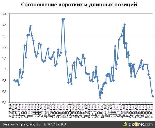 Обратив внимание на открытые юридическими лицами позиции по фьючерсу на индекс, можно заметить, что настроения крупных игроков за последние 3 дня снова изменились в сторону покупок. Соотношение коротких и длинных позиций сейчас составляет 0,75 против 0,80 по данным на пятницу.