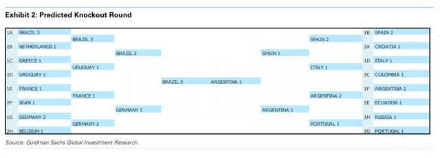 По оценкам GS, наибольшие шансы на победу на текущем мундиале (от исп. Copa Mundial de Fútbol) у хозяев турнира. По мнению экспертов, в финале сборная Бразилии встретится с командой Аргентиной и победит.