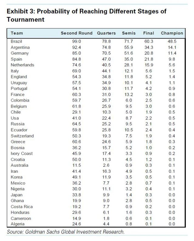 Стоит отметить, что это первый прогноз GS, в котором использован научный подход. Прежде оценки GS формировались на более субъективных факторах, нежели сухая статистика. В 2006 и 2010 гг. экспертам банка удавалось предсказать 2 из 4 участников полуфинала.