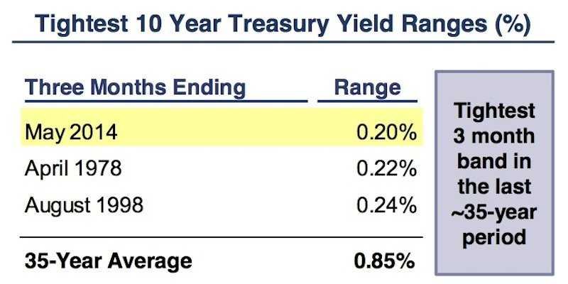 Он также обнародовал некоторые данные, которые показывают текущую ситуацию в исторической перспективе. В настоящее время доходность американских ГКО находится в самом сжатом торговом диапазоне с 1978 года.