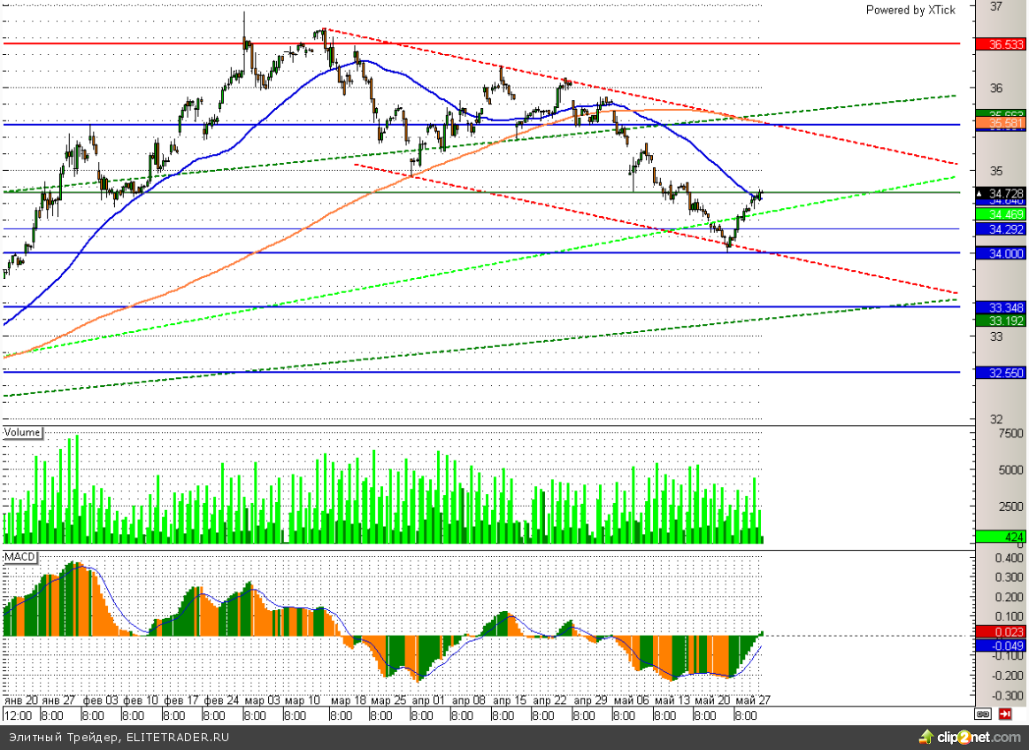 При этом внешний фон достаточно противоречив и пока не предвещает сильных движений. Нефть консолидируется вблизи 110 долларов за баррель по сорту Brent, да и макроэкономическая статистика выходит преимущественно смешанном ключе. В частности хуже ожиданий накануне вышли данные по ВВП США за первый квартал (-1%), но зато количество заявок на пособия по безработице обрадовало инвесторов, упав за прошедшую неделю до 300 тыс.