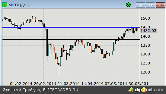 В пятницу индекс вторично протестировал верхнюю границу диапазона 1455-1380 пунктов. При этом котировки не показали предыдущего максимума, что косвенно может говорить о слабости покупателей у текущего сопротивления. Таким образом, напрашивается развитие новой волны движения вниз в рамках действующего диапазона.