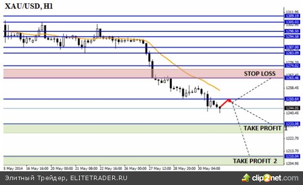 Кроме того, на текущей неделе будет опубликован целый блок отчетов по экономике США. Уже сегодня выйдут данные по деловой активности в секторе обрабатывающей промышленности ISM. Ожидается небольшое снижение показателя (до 55,4 от 55,9 в апреле). Но если отчет выйдет в соответствии с прогнозами, сильной реакции, скорее всего, не последует. В среду, будут опубликованы одноименные данные, но уже из сферы услуг, которая в экономике США играет куда более значимую роль. Тогда же выйдут данные по занятости в частном секторе от ADP. Вкупе с компонентом занятости ISM он позволит строить предположения относительно динамики ключевого отчета по рынку труда США (NFP), который будет опубликован в ближайшую пятницу. Увеличение числа новых рабочих мест станет очередным подтверждением тому, что ФРС США продолжит рассматривать возможности более быстрого перехода в режим ужесточения монетарной политики. Таким образом, даже умеренно позитивная статистика из Штатов с довольно высокой долей вероятности продолжит оказывать давление на котировки золота, которое может снизиться к уровню 1233,08 с дальнейшей целью на 1210,04. Хотя перед этим актив все же может совершить небольшой откат в район уровня 1250,64, так как в краткосрочной перспективе после 4 дней активного падения он выглядит несколько перепроданным.
