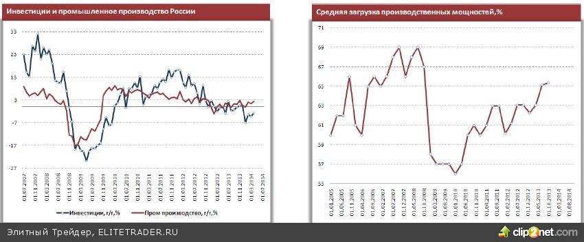 Падение потребительского спроса и ухудшение условий кредитования, заставило компании пересматривать свои инвестиционные проекты. В 2013 году впервые с кризисного периода инвестиции в основной капитал показали снижение, достигнув максимального падения на 7% в годовом выражении. Весной 2014 года инвестиции показывают чуть лучшую динамику – снижение на 3-4%, при определенном оживлении в промышленном производстве, которое в апреле выросло на 2,4%, по-видимому, за счет загрузки существующих мощностей