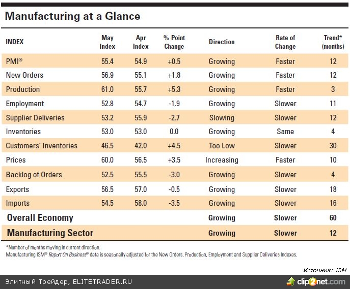 Вчера расшевелить активность инвесторов не смогла даже курьезная ситуация с отчетом авторитетной организации - ISM. Впрочем, возможно имелся напротив негативный эффект. Ожидаемый традиционно в 18:00 мск отчет по деловой активности в производственном секторе изначально указал на снижение индекса с апрельских 54,9 пункта до 53,2, тогда как аналитики ожидали роста до 55,5. Но довольно быстро стало понятно, что в расчетах организации закралась ошибка в связи с сезонной коррекцией. При этом в CNBC сообщили, что корректировка будет до 56 пунктов, но окончательные цифры ISM опубликовал спустя почти три часа после первоначальных сообщений, заявив о пересмотре до 55,4 пункта. Таким образом, экономическая активность в промышленности растет 12 месяцев подряд. Из 18 отраслей в 17 сообщили о росте деловой активности.