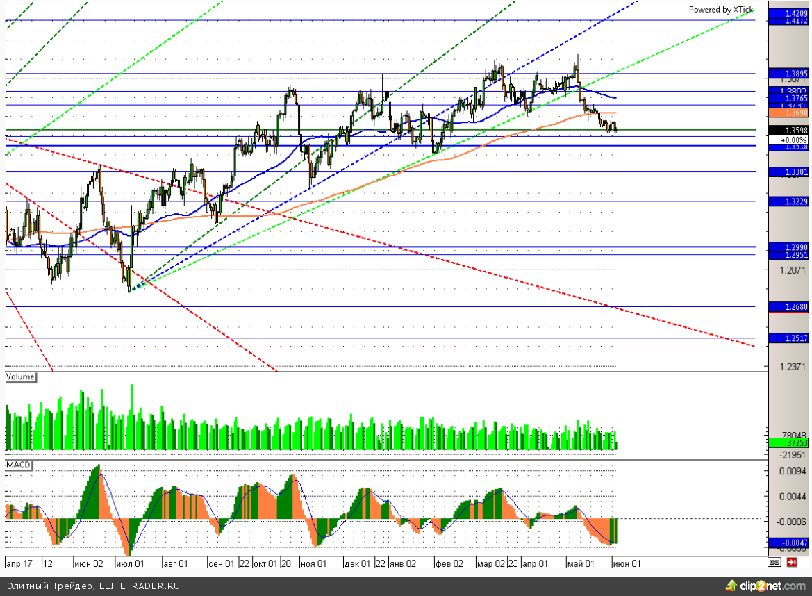 В свою очередь европейская валюта продолжает консолидироваться в районе отметки 1,36. Данный уровень является сильной поддержкой и его пробой может стать сигналом к ускорению снижения. Драйвером для этого вполне может стать предстоящее 5 июня заседание ЕЦБ, от которого участники ждут новых стимулирующих мер. В свою очередь если регулятор не предпримет никаких действий или перенесет сроки начала стимулирования, то евро может совершить решительный рывок вверх с ближайшей целью 1,37.