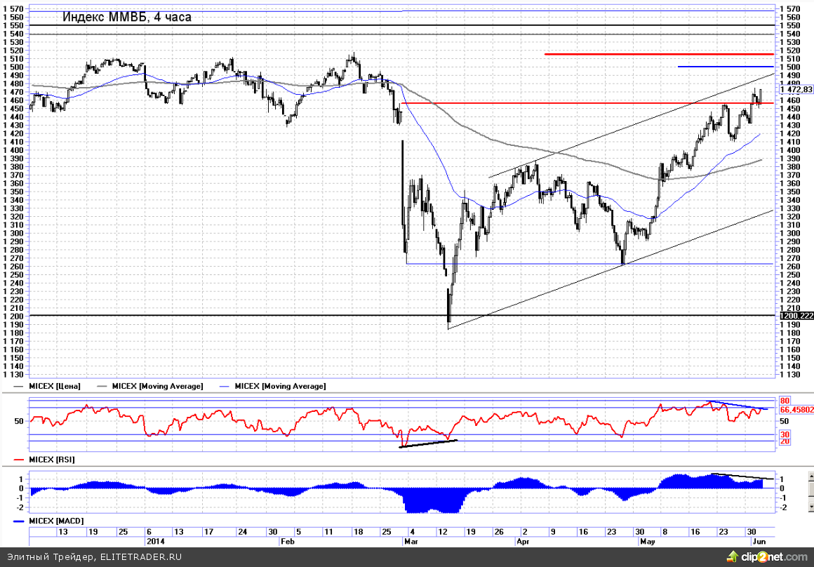 Во вторник российский рынок акций подтвердил актуальность и силу восходящей тенденции. Как и ожидалось, вчерашнее снижение на открытии, которое было спровоцировано неестественными колебаниями на вечёрке понедельника, к концу дня было благополучно выкуплено. Растущий тренд пока остается в центре внимания, однако, как мы уже ранее говорили, его потенциал ограничен широкой зоной торможения 1490-1515. Выше этого диапазона в перспективе двух месяцев (разгар дивидендного сезона) рынок уйти не сможет. Уже сейчас появляются технические предпосылки к скорой остановке тенденции. Снова повторю что, несмотря на смотрящие наверх трендовые индикаторы, с текущих отметок потенциал роста не превышает 2-2,5%, так что открывать длинные позиции уже не очень интересно с точки зрения соотношения риск/доходность.