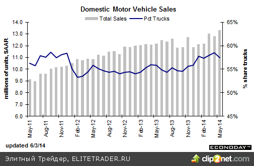 Среди отдельных бумаг отметим рост в акциях автопроизводителей на фоне обнародованных цифр по продажам за май. Совокупные продажи выросли до 16,77 млн. автомобилей, против прогнозных 16,1 млн. В General Motors (+1,15%) отметили, что продажи в мае были лучшими за этот месяц в течение последних семи лет, превзошли прогнозы и данные Ford (+0,67%).