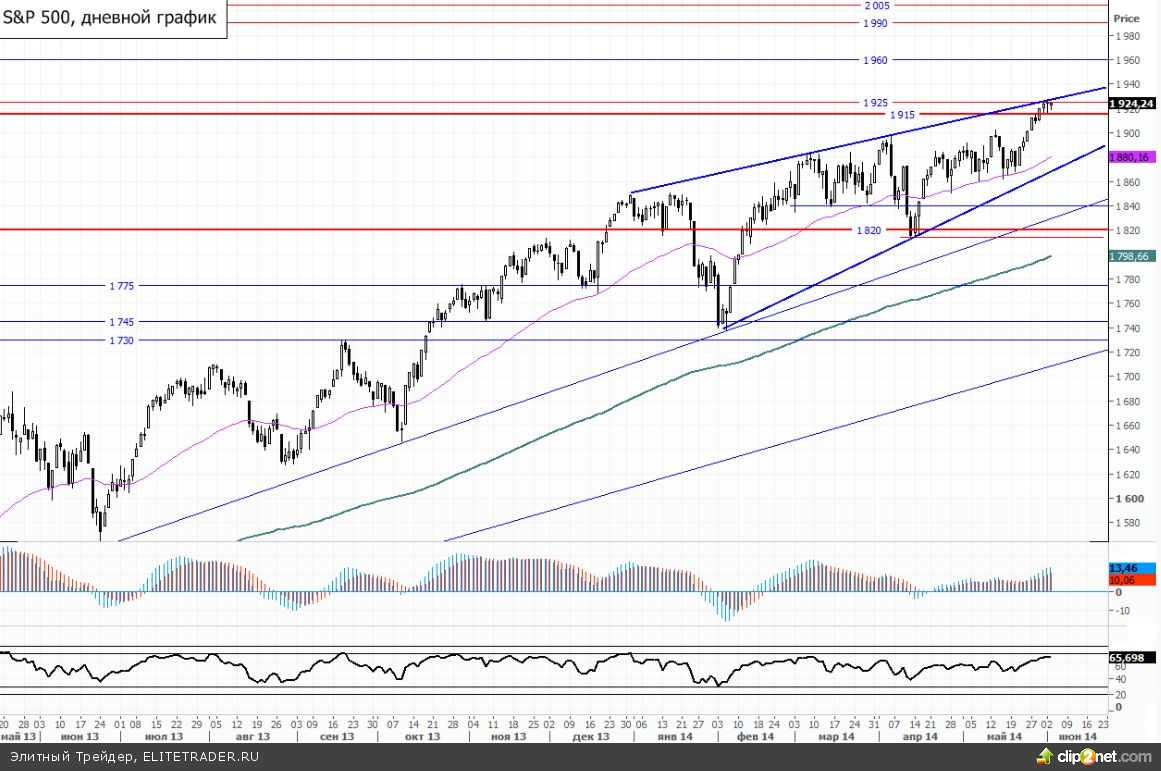 Стоит обратить внимание на то, что котировки SnP 500 сегодня вплотную подобрались к верхней границе восходящего клина. Диагональный уровень сопротивления сейчас как раз проходит в районе 1925 пунктов. Вчера эта линия снова выступила препятствием для продолжения дальнейшего роста.