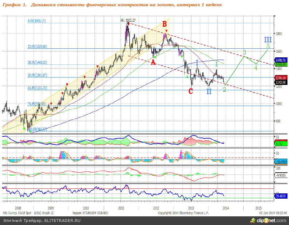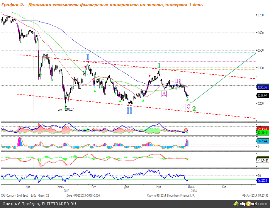 Цены на золото продолжили формирование коррекционной волны 2, в рамках которой котировки драгоценного металла могут снизиться до уровня $1220-1240 за тройскую унцию. Довольно часто волна 1 корректируется глубоко, что позволяет сформировать так называемое «тройное дно» – один из вариантов разворотной модели. По достижении ценами на золото уровня $1220-1240 ожидаем возобновление роста – начало формирования восходящей растянутой волны 3. Предполагаемая структура динамики цен на золото отображена на графиках 1 и 2.