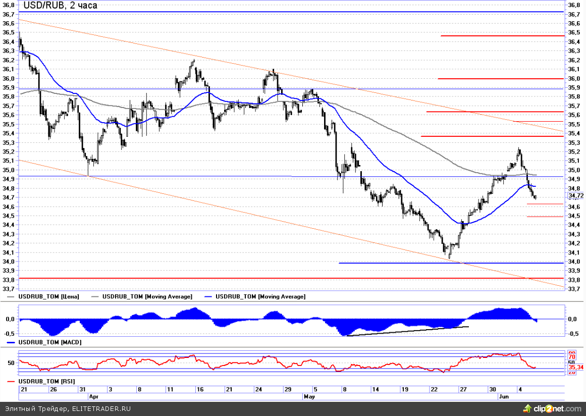 Что касается ситуации с рублем, то вчера мы наблюдали за его уверенным укреплением. По отношению к доллару курс откатился в район 34,70. Ближайшая расчетная точка опоры, от которой доллар снова может начать укрепляться, находится на 34,49-34,64 (usd/rub tom). В то же время спуск ниже этих рубежей может вновь актуализировать сценарий со снижением к 33,80.