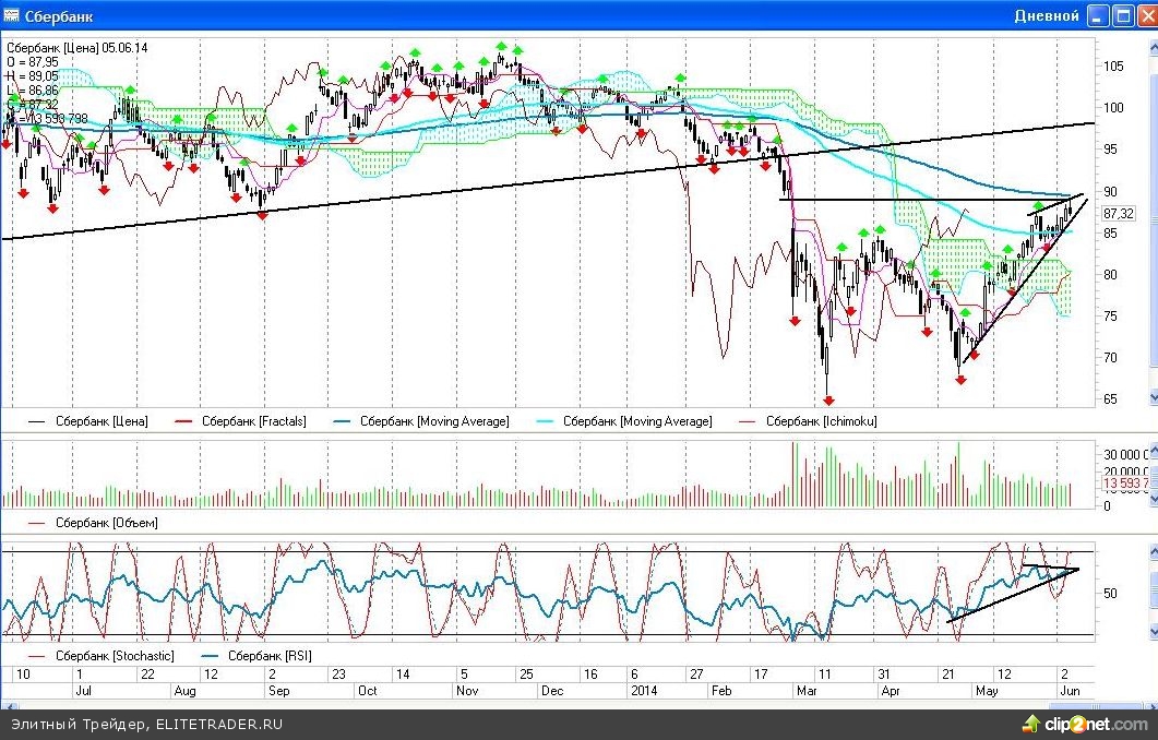 Глядя на их дневной график, на котором четко обозначились расхождения между установленными вершинами, и проявилась модель восходящий «клин», теперь я ожидаю пробоя зоны 86-86,5 рублей, для того, чтобы получить сигнал к продажам.