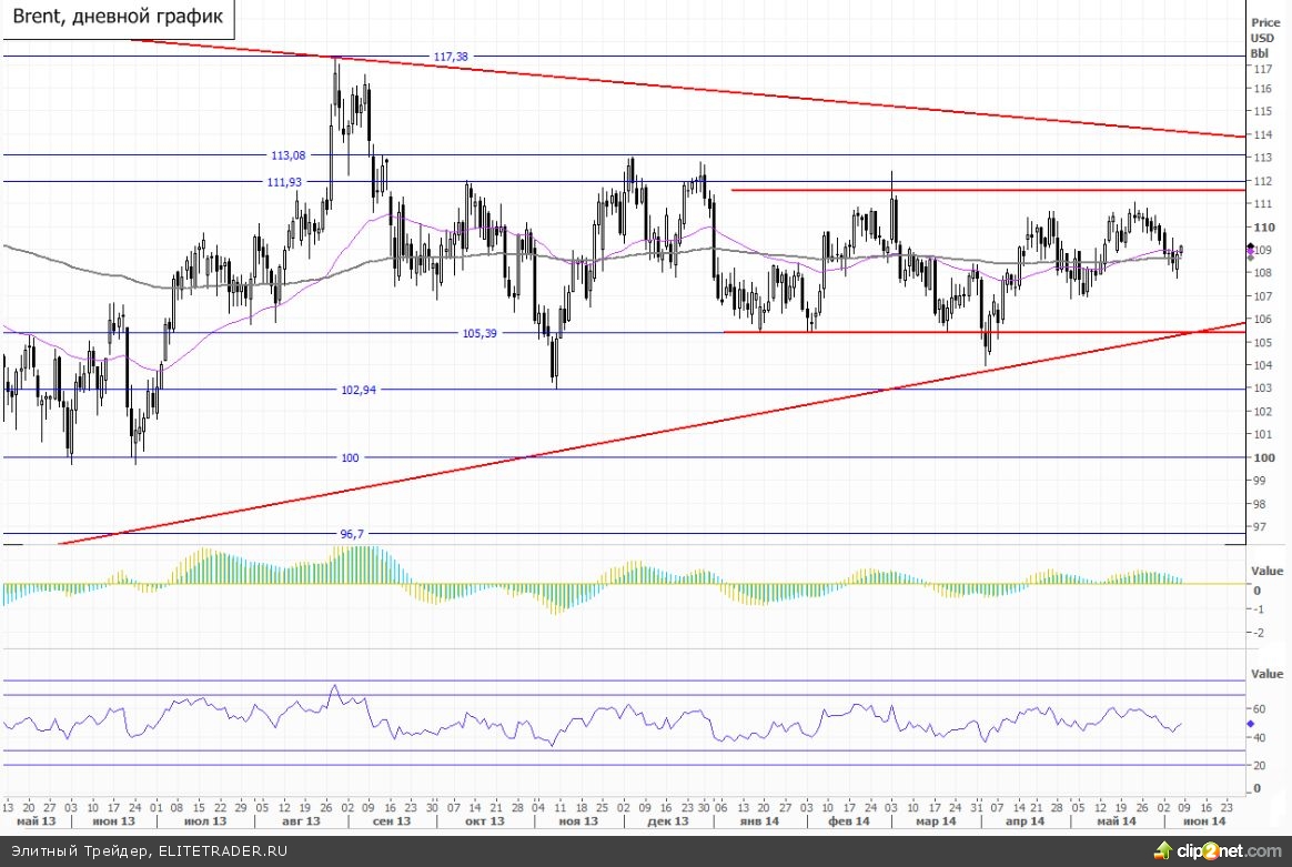 Ситуация на рынке нефти продолжает развиваться в рамках бокового сценария. Весь 2014 года мы наблюдаем за безыдейными колебаниями цены Brent в рамках заезженного коридора. Любой намек на выход за пределы сформировавшегося диапазона консолидации очень быстро нивелируется. Активно торговать таким инструментом получается только на очень короткую дистанцию, продавая и покупая от границ боковика. В текущей ситуации я бы поставил пробойную идею по Brent в режим ожидания. С учетом длительности периода консолидации прорыв одной из границ торгового диапазона должен вызвать мощный импульс. Нужен лишь какой-то триггер, который взорвет волатильность. В случае если котировки Brent преодолеют зону $111-112, то далее спекулянтам можно будет рассчитывать на солидное ускорение наверх. Снизу ключевой точкой опоры выступает рубеж $105-106 за баррель.
