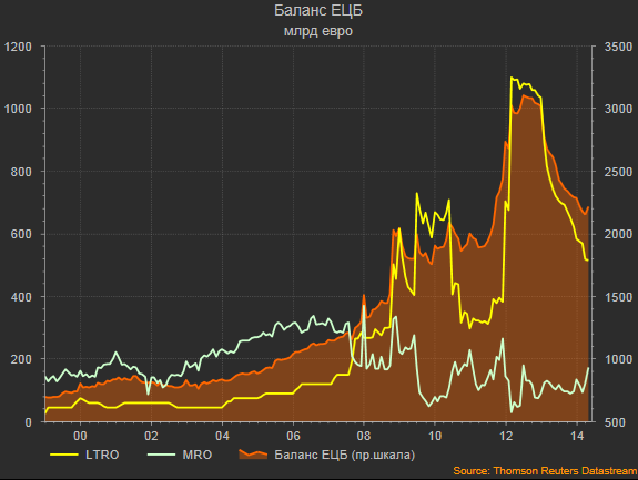 На графике видно, что LTRO с 2011 стал основным источником фондирования банковской системы и основной причиной роста баланса ЕЦБ. До кризиса основное фондирование через MRO (краткосрочные, недельные кредиты). С 2012 вернули почти 80% кредитов, баланс ЕЦБ сократился от максимума весны 2012 на 900 млрд евро к настоящему моменту.