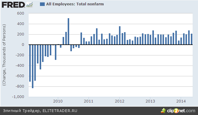 Более интересная часть - результаты подсчета цифр платежных ведомостей, указали на рост рабочих мест в мае на уровне 217 тыс., из них 216 тыс. в частном секторе. Аналитики ожидали 218 тыс. Таким образом, четвертый месяц подряд темпы роста превышают 200 тыс., и годовое среднее продолжает кружить возле этой отметки. Среднечасовая заработная плата продолжает увеличиваться, составив в мае $20,54, хотя темпы ее роста весьма и весьма скромные.