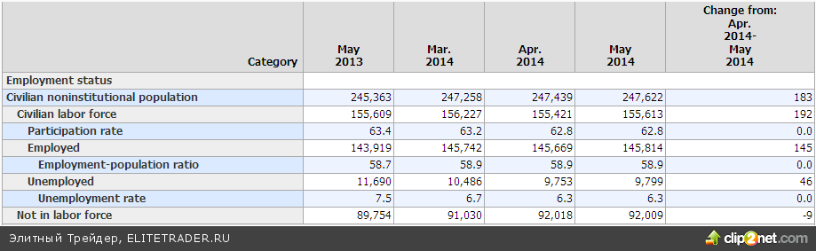 Что касается отчета по рынку труда за май, обнародованные цифры не принесли на рынок негатива, напротив, фьючерс на индекс SnP500 после публикации рванул вверх. Первая часть отчета - опрос домохозяйств на удивление не выявил почти никаких значимый изменений. Гражданская рабочая сила увеличилась на 192 тыс., из них с учетом снижения в категории Not in labor force на скромные 9 тыс., 145 тыс. получили статус занятых 46 тыс. - безработных. Итоговые коэффициенты, включая уровень безработицы (6,3%), остались без изменений. Аналитики ожидали роста безработицы до 6,4%.