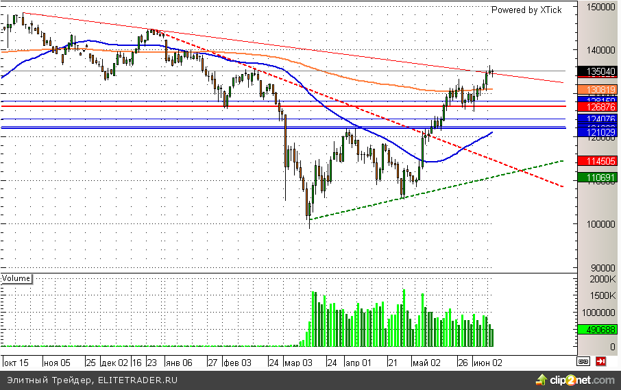 Таким образом, основные поводыри сейчас дают умеренно позитивный сигнал. Дополнительным позитивом сейчас является бэквордация более чем в 0,6% между фьючерсом на индекс РТС и самим индексом, которая до экспирации (16.06.14) обязательно будет отыграна. В свою очередь про риски снижения забывать не стоит. Поэтому при закреплении ниже 133800 длинные позиции желательно закрывать.