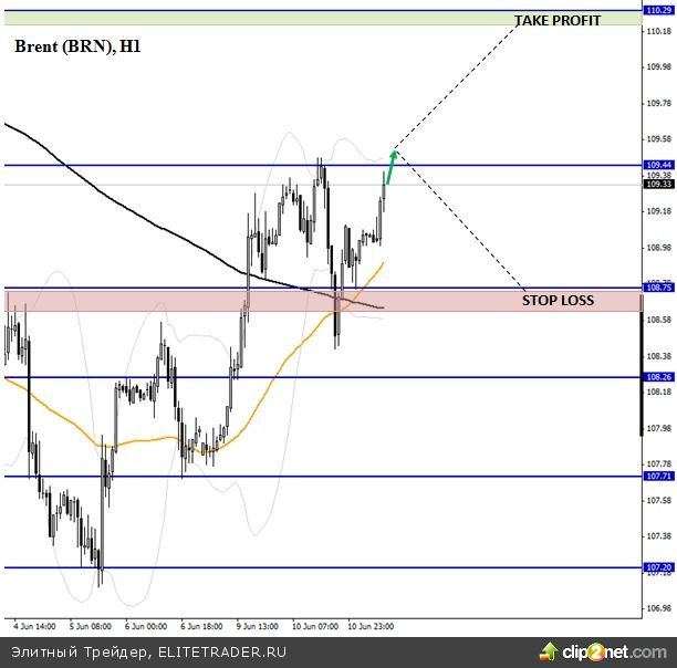 Торговые рекомендации: покупаем Brent, если котировки закроются выше уровня сопротивления 109,45 и выше верхней полосы Боллинджера (20;2) на часовом графике. Цель 110,30. Stop-Loss = 108,70