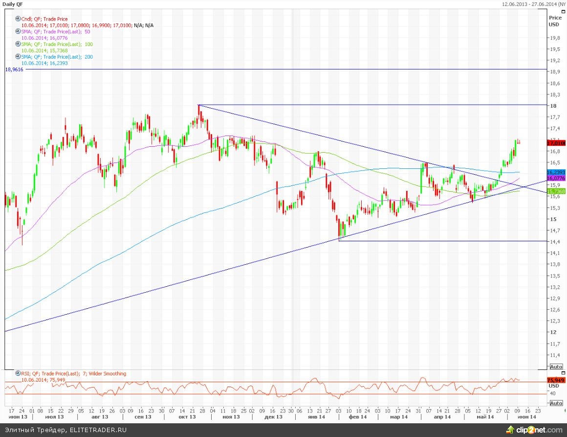 Техническая картина довольно противоречива. Примерно две недели назад акции пробили нисходящую линию среднесрочного тренда и продолжили рост. Котировка на закрытии 10 июня- $17,01. Сейчас бумаги движутся в район $18 (максимум октября прошлого года). При этом на осцилляторе RSI(7) наблюдается определенная перекупленность и медвежья дивергенция. Это может быть признаком грядущей коррекции в бумагах. В этом случае акции могут снизиться на долгосрочную линию восходящего тренда - $16. Данный уровень может стать возможной точкой для входа в позицию. Ключевым риском в данном случае является начало масштабной коррекции по рынку в целом, в этом случае возможен уход акций на $14,4 – минимум этого года.